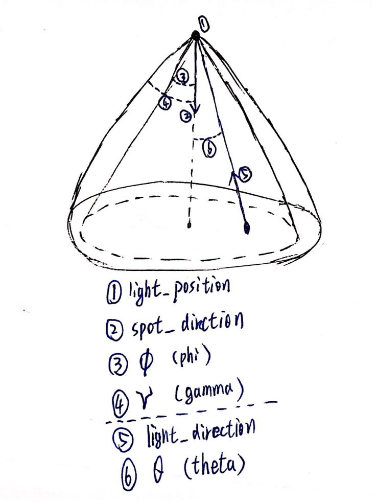 聚光灯的光照强度系数 (对光照强度的影响) 为 \(\frac{cos(\theta)-cos(\gamma)}{cos(\phi)-cos(\gamma)}\)