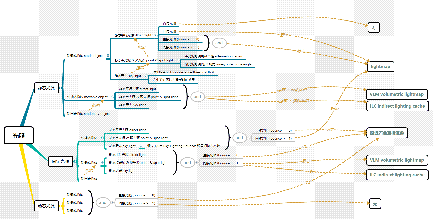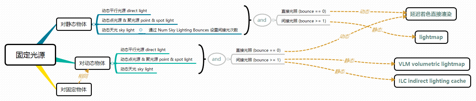 原来, 对于静态光源, ue 同样使用了 lightmass 所采用的动态GI方案, 即我们后面会提到的 体积光照贴图 (VLM, volumetric lightmap) 和 间接光照缓存 (ILC, indirect lighting cache), 这两种技术的原理类似, VLM 是 ILC 的优化和替代品, 现在 ue4 默认的设置是 VLM (可以改为 ILC)。