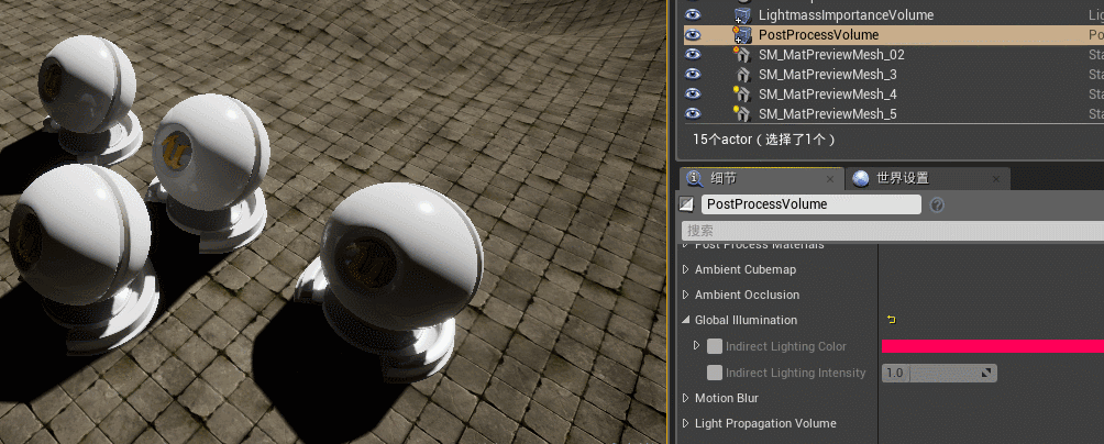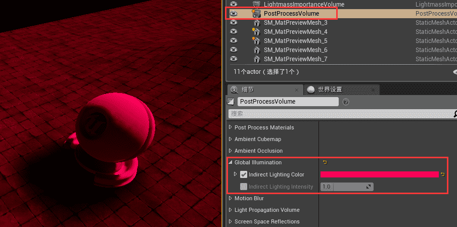 下面我们重新将 WorldSetting -> Num Indirect Lighting Bounces 设置为3, 并启用 ppv 中的间接光红色效果。