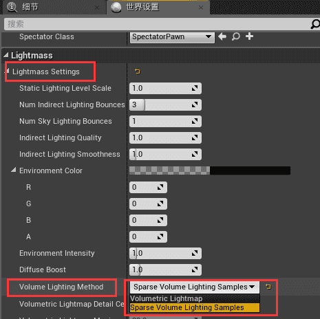 同时, 我们也可以切换到__间接光照缓存 (ILC, indirect lighting cache)__, 这是旧版本的主要机制, 官方方法是 VLM 会逐步取代 ILC, 通过 WorldSettings -> Lightmass -> Lightmass Settings -> Volume Lighting Method 选项, 选择 Sparse Volume Lighting Samples。