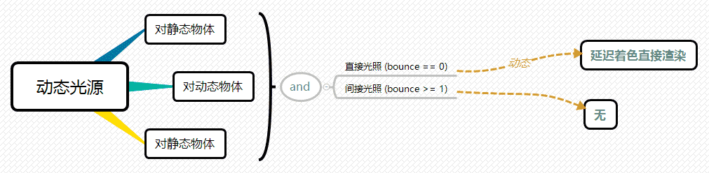固定光源对静态物体的直接光照 (bounce == 0) 是直接采用延迟着色渲染出来的, 并没有使用光照贴图, 所以一些属性 (除了位置) 可以在运行的时候修改 。