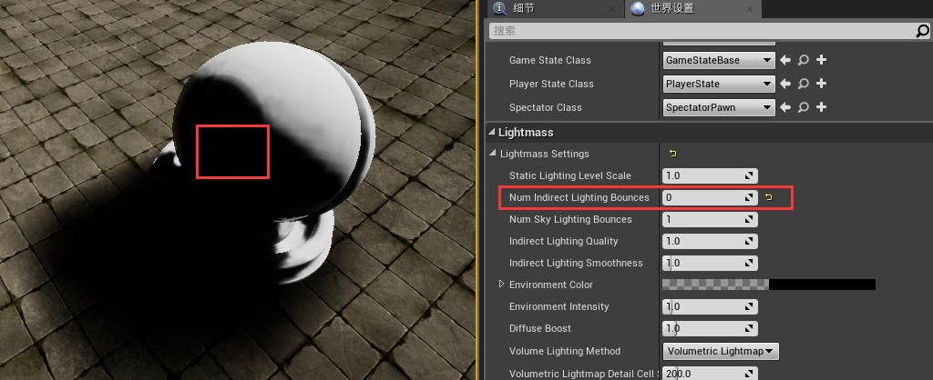 我们将 WorldSetting 里的 Lightmass 选项里的 Num Indirect Lighting Bounces 设置为 0 (默认是3, 表示间接光会弹跳3次)