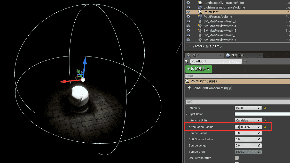 点光源可以调节 衰减半径 (attenuation radius) -> 在细节面板的 Light -> Attenuation Radius