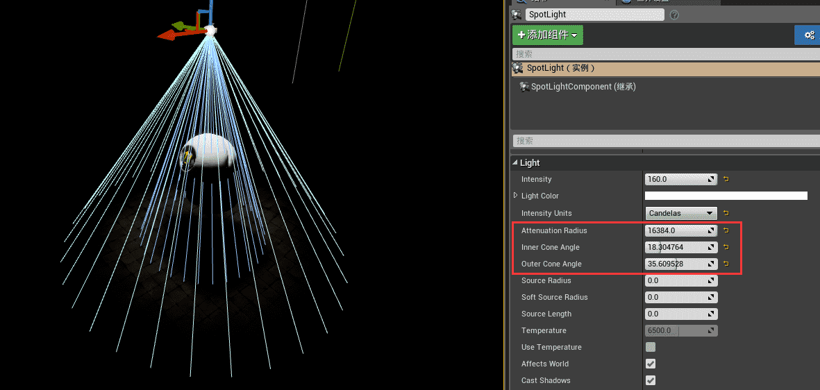 聚光源除了衰减半径, 还可以调节 内切角 (inner cone angle) 和 外切角 (outer cone angle), 也是用来控制衰减范围的, 在细节面板的 Light -> Inner Cone Angle 和 Light -> Outer Cone Angle