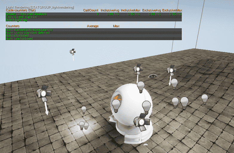 我们多打一些静态光,然后运行游戏, 尝试显示其 rendering 信息, 输入命令 stat lightrendering。