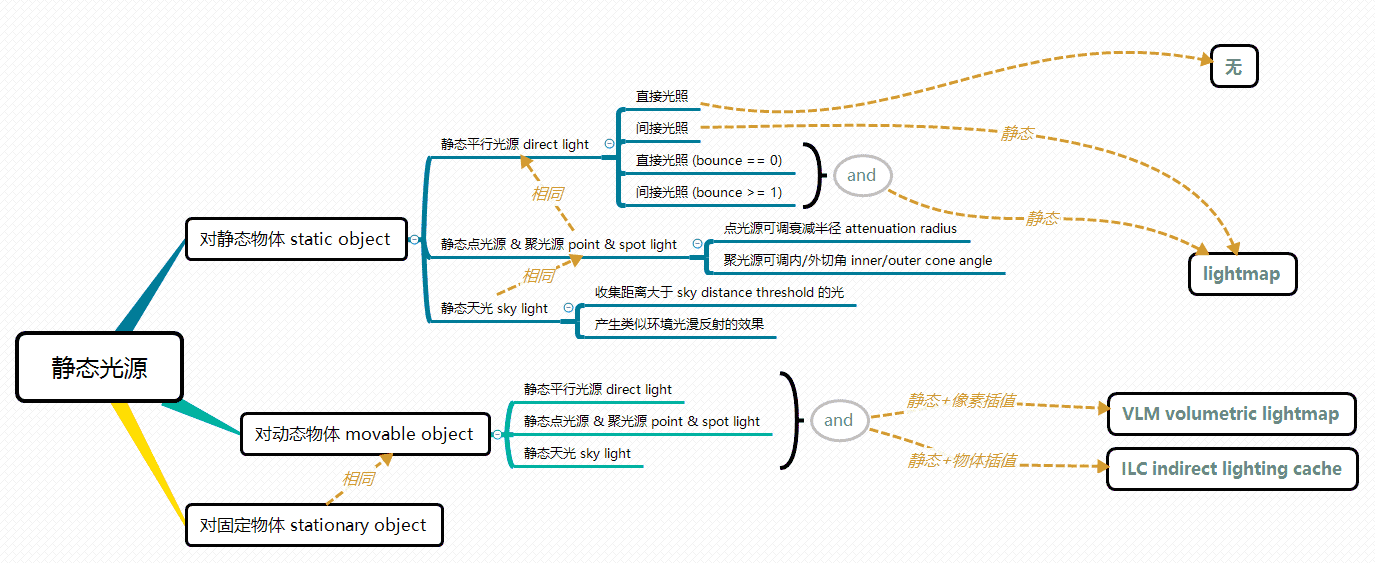 静态光对于静态物体,会完全烘焙光照 (通过 lightmass),使用光照贴图 lightmap 作用于物体。