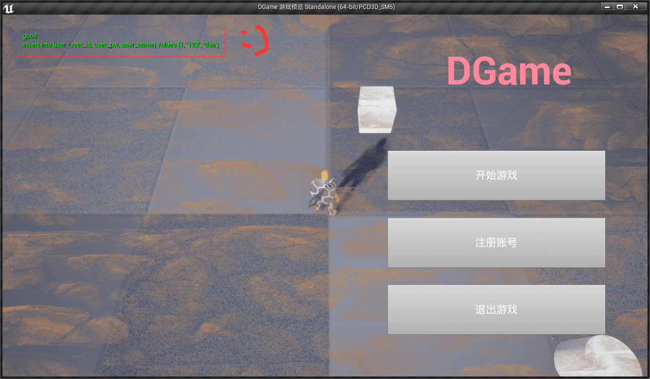 1 2 3 4 5 6 7 8 9 10 11 12 13 14 15 16 17 18 void ADGameGameModeBase::BeginPlay () { Super::BeginPlay (); FSQLiteDatabase my_db; if (my_db.Open (TEXT ("E:/mydb.db" ), nullptr , nullptr )) { int id = 1 ; FString pw = TEXT ("'123'" ); FString name = TEXT ("'dua'" ); FString sql = FString::Printf (TEXT ("insert into user (user_id, user_pw, user_name) values (%d, %s, %s)" ), id, *pw, *name); GEngine->AddOnScreenDebugMessage (-1 , 10.f , FColor::Green, sql); if (!my_db.Execute (*(sql))) { GEngine->AddOnScreenDebugMessage (-1 , 10.f , FColor::Green, "no" ); } else GEngine->AddOnScreenDebugMessage (-1 , 10.f , FColor::Green, "good" ); }
