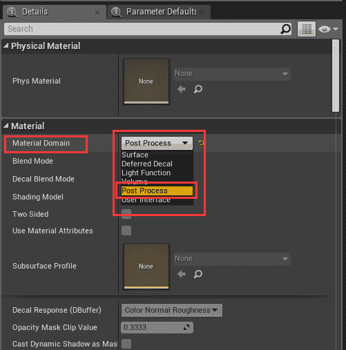 将一个材质的 Materail Domain 设置为 Post Porcess 便会将其设置为后处理材质