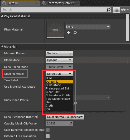 对于每一个材质而言, 都有一个枚举量 Shading Model 可供选择